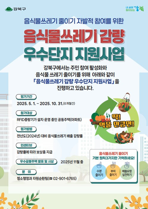 [시민일보 = 문민호 기자] 서울 강북구(구청장 이순희)는 음식물쓰레기 감량을 위해 오는 5월부터 ‘음식물쓰레기 감량 우수 공동주택 지원사업’을 본격 추진한다고 밝혔다.