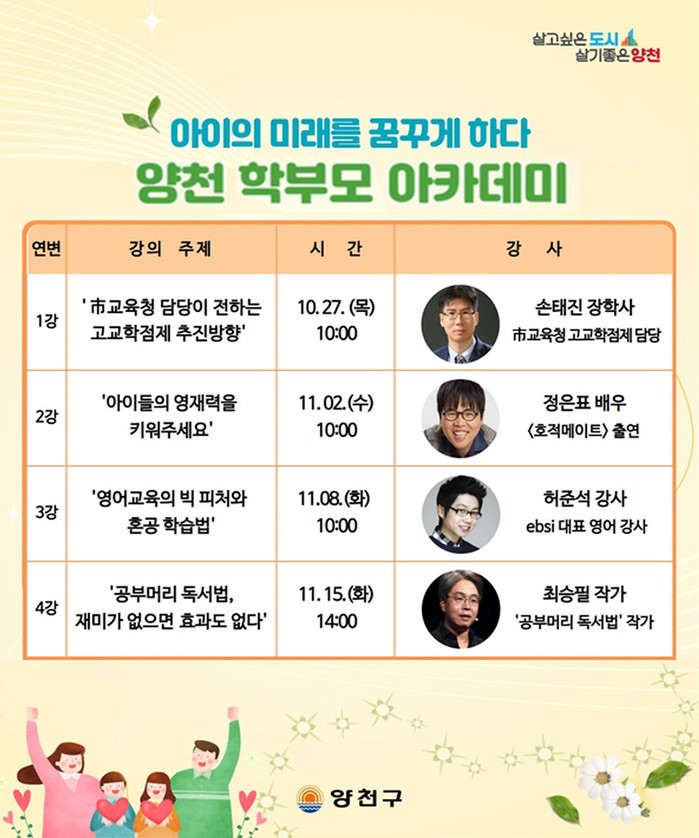 [시민일보 = 박준우 기자] 서울 양천구(구청장 이기재)는 오는 15일까지 양천디지털미디어센터에서 교육비법 및 정보 등을 공유하는 '2022년 학부모 아카데미'를 진행한다.