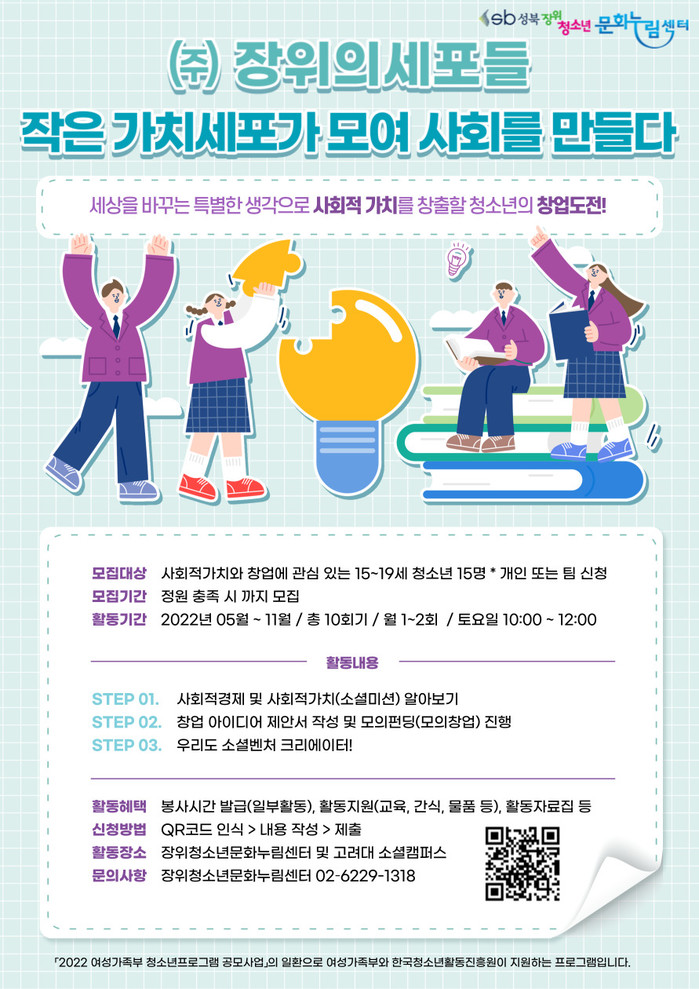 [시민일보 = 홍덕표 기자] 서울 성북구립 청소년시설 장위청소년문화누림센터가 청소년 사회참여 활성화 프로그램 '(주)장위의 세포들' 참가자를 모집한다.