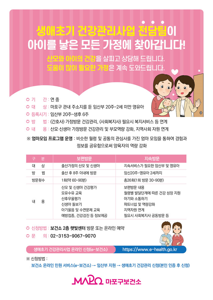 ‘생애초기 건강관리사업’의 대상자는 지역내 주소지를 둔 임신 20주 이상 임산부와 2세 미만 영유아가 있는 출산가정으로, 신청은 임신 20주부터 출산 후 생후 6주까지 보건소 2층 햇빛센터를 방문하거나 e보건소 홈페이지에서 온라인으로 예약할 수 있다.