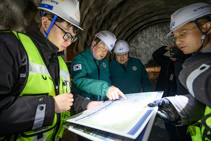 김현수 경기 수원시 제1부시장이 최근 동탄인덕원선 건설사업 현장을 방문해 사업 추진 현황을 점검했다. 사진은 현장을 방문한 김 제1부시장(왼쪽 두 번째)이 시공사인 (주)한화건설 현장소장 등 관계자의 설명을 듣고 있는 모습. (사진=수원시청 제공)