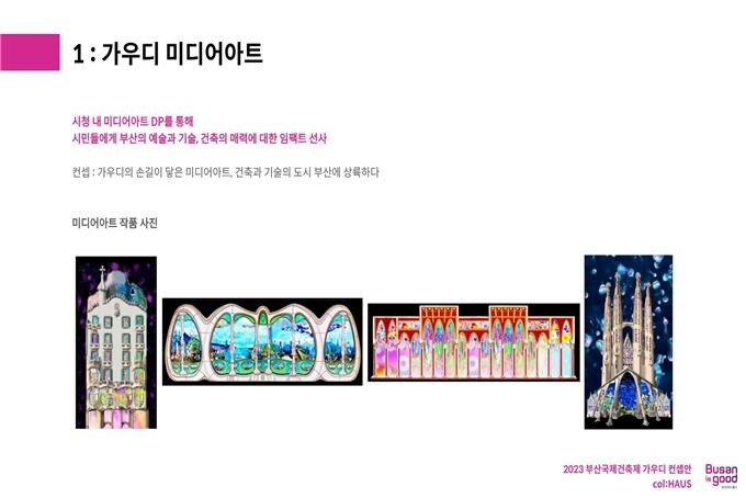 '가우디 미디어아트'는 세계적인 건축가 안토니 가우디의 유작을 모티브로 가우디의 세계관을 한국의 혼으로 시청각을 넘나들며 재해석한 미디어아트다. 이 미디어아트 곳곳에는 안토니 가우디가 남긴 건축물과 부산의 건축물들이 함께 숨어 있다.