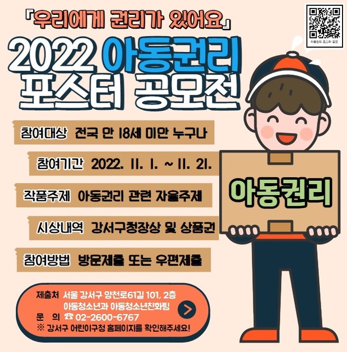 [시민일보 = 홍덕표 기자] 서울 강서구(구청장 김태우)가 아동권리주간을 맞이해 1일부터 오는 21일까지 '2022년 아동권리 포스터 공모전'을 개최한다.