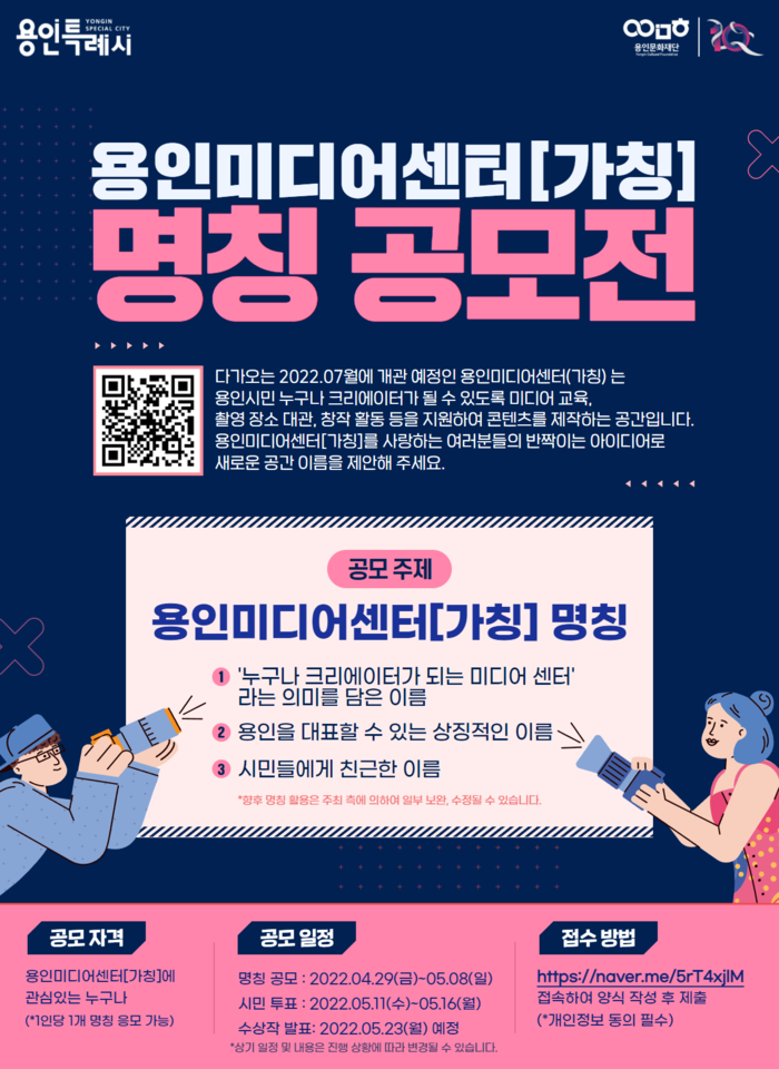 이번 공모전은 시설에 어울리는 명칭을 시민들의 아이디어를 통해 선정하기 위해 진행된다. 용인미디어센터에 관심 있는 사람이라면 누구나 참여가 가능하며, 온라인 링크를 통해 접수하면 된다. 오는 5월 8일 까지 실시하고, 명칭 선정을 위한 투표는 5월11일부터 16일까지 진행된다.