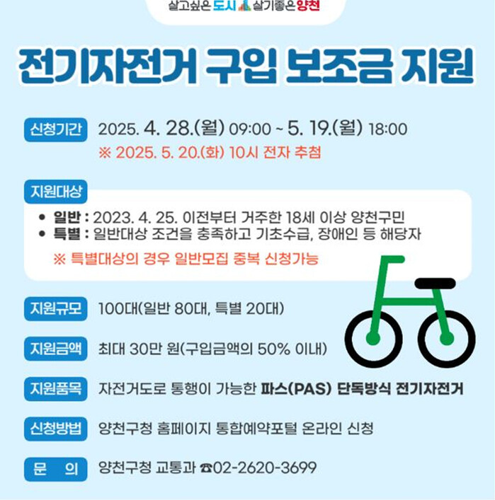 | ▲ 양천구, 2025년 전기자전거 구입 보조금 지원 안내 이미지. (사진=양천구청 제공) |
