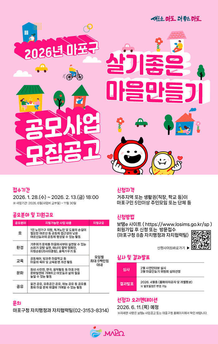 [시민일보 = 문민호 기자] 마포구(구청장 박강수)는 주민이 제안한 아이디어를 지원해 마을공동체 활성화를 도모하는 ‘2026년 마포구 살기좋은 마을만들기 공모사업’ 참여 대상자를 오는 2월13일까지 모집한다.