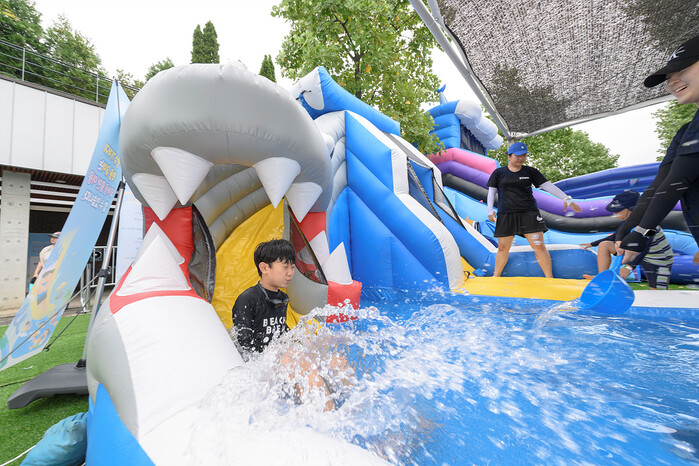 물놀이장에는 수심 120cm ‘대형 풀장’ 1동과 50cm 깊이의 ‘유아풀’ 2동 외에도 워터슬라이드, 분수터널, 물바구니 등 다채로운 놀이시설이 설치돼, 연령별 안전하고 재미있는 물놀이가 가능하다. 주말에는 마술 공연과 가족이 함께하는 물총게임 등 흥미로운 이벤트도 펼쳐진다.