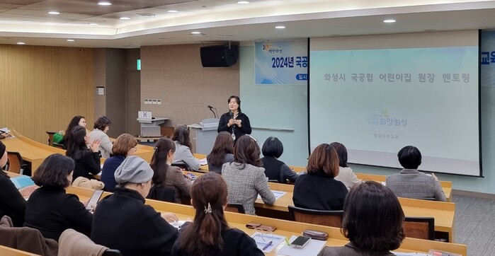 경기 화성시가 최근 2024년 화성시 국공립어린이집 원장 대상 멘토링 프로그램의 멘토 10명을 위촉하고 사전교육을 진행했다. 위촉식에서는 2024년 멘토로 위촉된 원장들에 대한 위촉장 전달을 비롯해 멘토의 역할 등에 대한 교육이 진행됐다. 사진은 이날 교육이 진행되고 있는 모습. (사진=화성시청 제공)