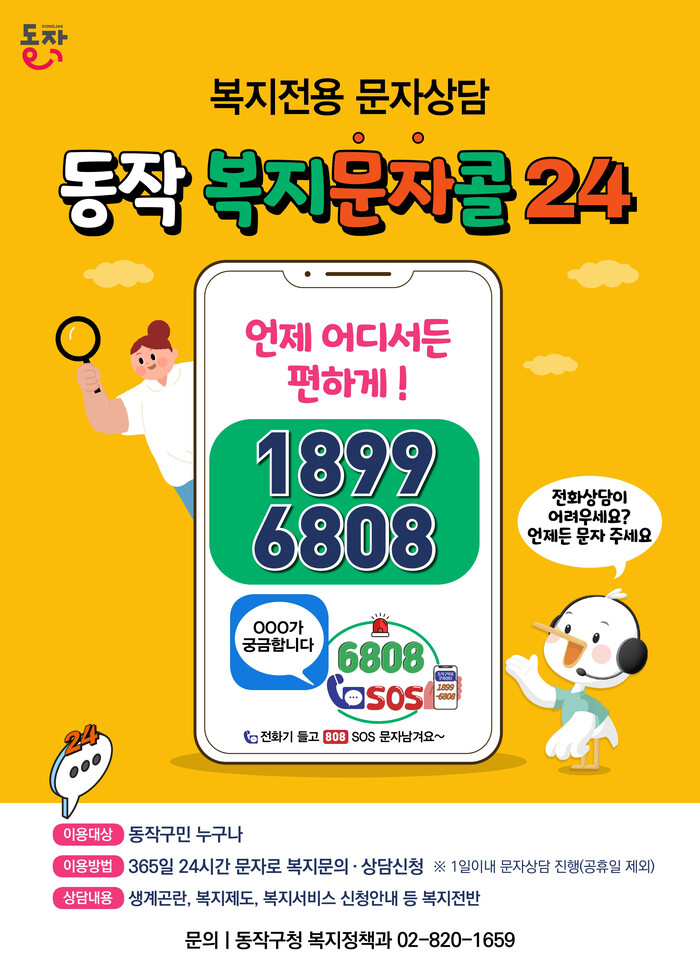 구는 오는 17일 구민 누구나 문자로 편하게 365일 24시간 복지상담을 신청할 수 있는 ‘동작 복지문자콜24’(이하 복지콜) 서비스를 전격 개시한다고 6일 밝혔다.