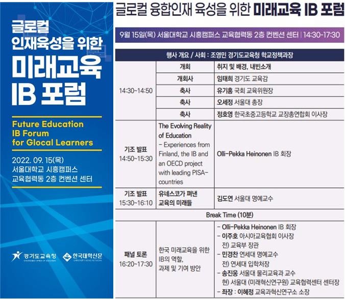 주제는 ‘대한민국 미래 교육의 방향과 전략-IB 프로그램의 기여 방안 및 과제’이며, 임태희 경기도교육감의 축사와 올리 페카 헤이노넨 IBO 회장의 기조 강연을 시작으로 이혜정 교육과혁신연구소 소장이 좌장을 맡아 패널토론으로 진행한다.