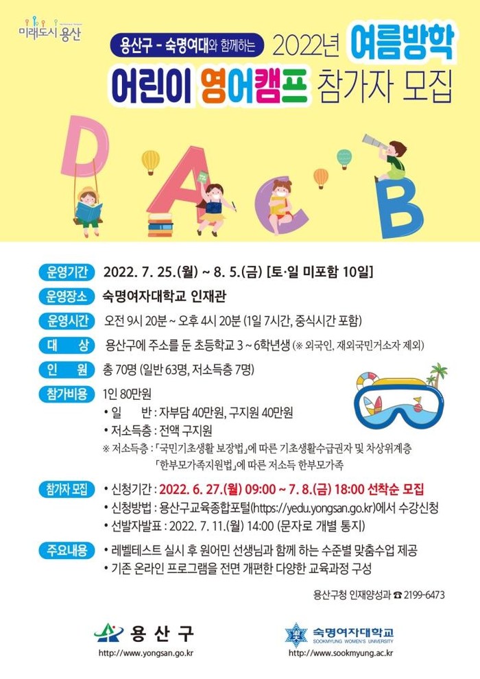 | ▲ 2022년 여름방학 어린이 영어캠프 참가자 모집 포스터. (사진제공=용산구청) |