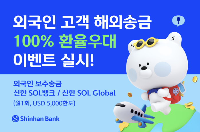 이번 이벤트는 ‘신한 SOL뱅크’ 또는 ‘신한 SOL Global’ 앱에서 거래외국환은행 지정 항목인 ‘외국인 보수송금’이 대상이며, 한도는 월 1회 최대 미화(USD) 5000달러까지다.