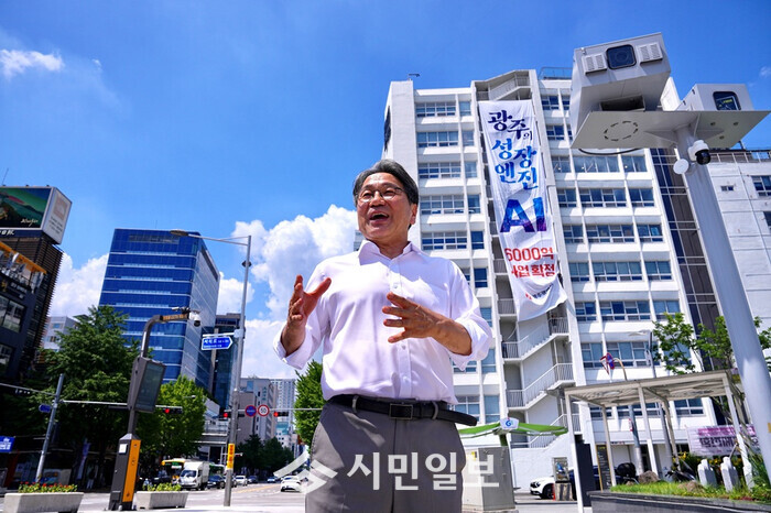 | ▲ 강기정 광주광역시장은 인공지능(AI) 2단계 사업 예타면제가 최종확정된 22일 5·18민주광장에서 AI사업 비전을 설명하고 있다. 이날 전일빌딩245에는 AI 예타면제를 축하하는 현수막이 내걸렸다. /광주광역시 제공 |
