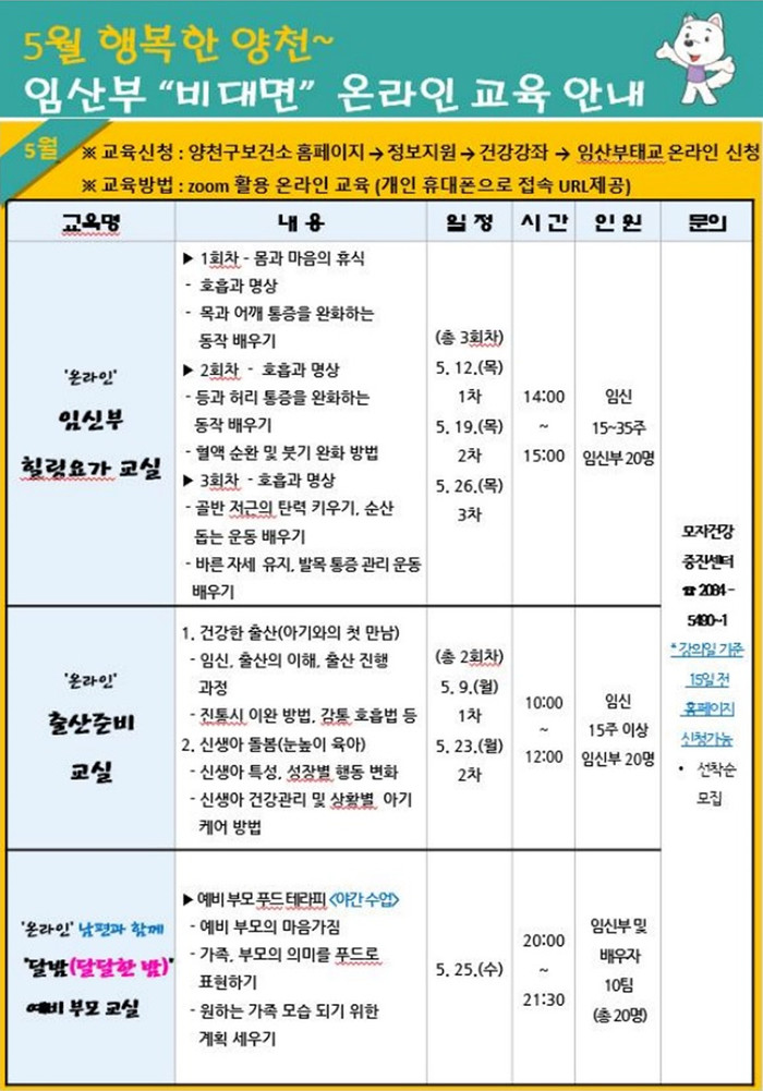 | ▲ 양천구 모자건강증진센터 5월 모성프로그램 안내 표. (사진제공=양천구청) |