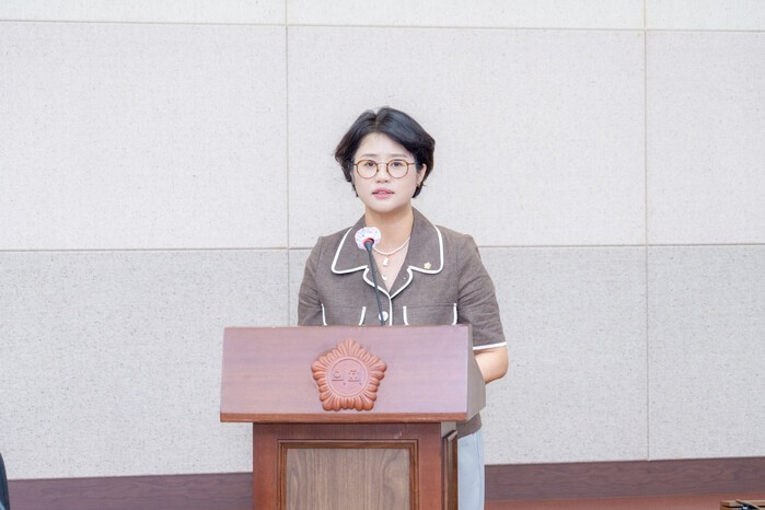 | ▲ 서울특별시 강남구의회 직장 내 괴롭힘 금지 및 피해 직원 보호 지원에 관한 조례안」 에 대해 제안 설명하고 있는 김진경 의원 |