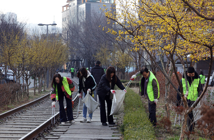 | ▲ 지난해 경춘선숲길 산책로를 함께 청소하고 있는 주민들의 모습. (사진=노원구청 제공) |