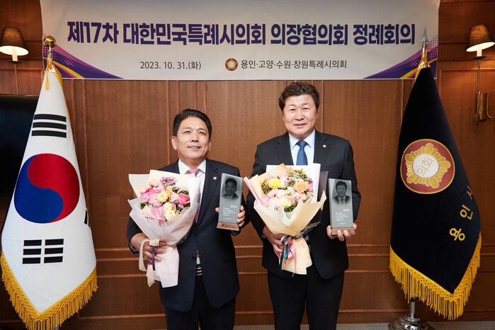 [용인=오왕석 기자] 용인특례시의회 김진석(양지면,동부동,원삼면,백암면/더불어민주당), 이창식(신봉동,동천동,성복동/국민의힘) 의원이 지난 31일 제17차 대한민국특례시의회 의장협의회 회의에서 공로패를 수상했다.