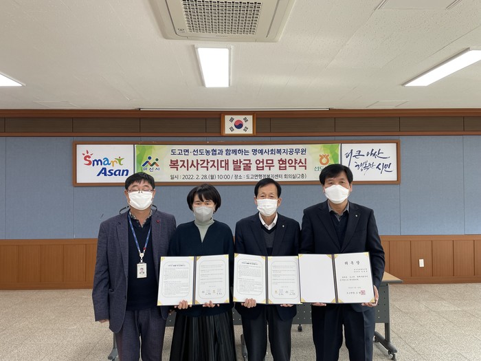 충남 아산시 도고면은 최근 선도농협과 복지 위기가구 발굴 업무협약을 체결하고 선도농협 직원을 명예사회복지공무원으로 위촉했다. 앞으로 농협 직원들은 지원이 필요한 주민을 발견하면 도고면에 연락해 보건복지서비스를 받을 수 있도록 돕는다. 사진은 협약식에서 관계자들이 기념촬영을 하는 모습. (사진제공=아산시청)