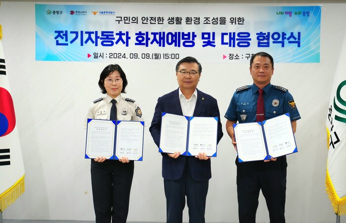 [시민일보 = 여영준 기자] 서울 중랑구(구청장 류경기)는 최근 중랑경찰서, 중랑소방서와 함께 전기차 화재 예방 및 대응을 위한 협약을 체결했다고 10일 밝혔다.