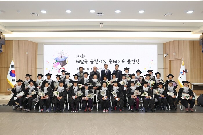 | ▲ 명현관 해남군수(맨 뒷줄 가운데)가 제2회 해남군 금빛여정 문해교육 수강생 졸업식에 민경매 해남군의원, 이성옥 의원, 민찬혁 의원과 함께 참석해 기념촬영을 하고 있다. / 사진 자료= 해남군 제공 |