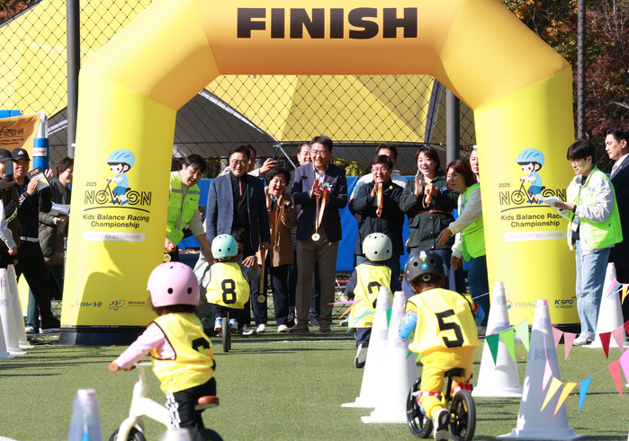 | ▲ 오승록 구청장이 ‘노원 익스트림 챌린지’ 키즈밸런스레이싱 대회 3세 어린이선수들의 경기를 응원하고 있다. (사진=노원구청 제공) |