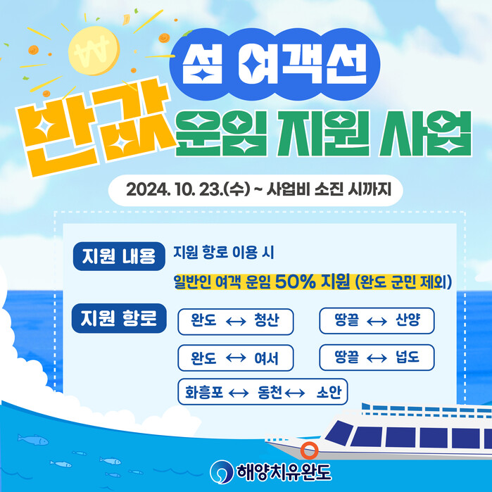 올해 초 시행된 ‘반값 여객선 운임제’는 관광객 방문 증가로 사업이 조기 마감됐으나 추가 예산을 확보해 23일부터 약 2주간 지원이 가능할 것으로 보인다.