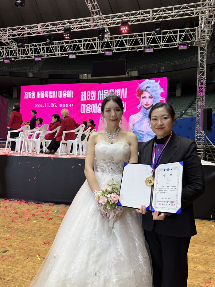 숭실사이버대학교(총장 한헌수) 뷰티미용예술학과 이지은 동문이 지난 11월 26일, 서울특별시 송파구 잠실실내체육관에서 개최된 ‘2024 제8회 서울특별시 미용예술경연대회’에서 ‘붙임 머리’ 부분 대상(서울시장상) 및 ‘신부 메이크업’ 부문 금상 등 2관왕을 달성했다고 5일 밝혔다.