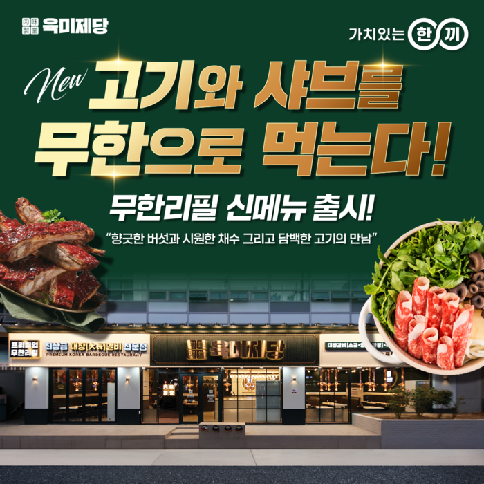 ‘맛있는 고기를 만드는 집’이라는 뜻의 육미제당은 기존 무한리필 고기집에서 볼 수 없던 ‘대장(大長)갈비’ 뿐 아니라 프렌치랙, 수제 양념구이, 마늘 갈매기살, 삼겹살 등 여러 종류의 고기와 정드린존, 치킨 등 다양한 셀프바 음식을 무한리필로 즐길 수 있다.