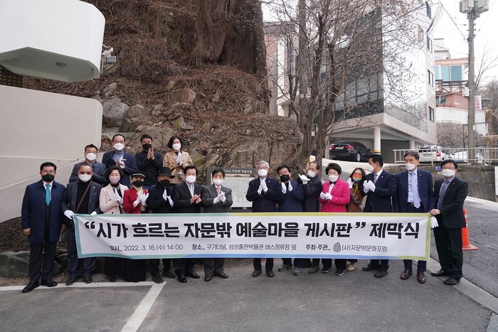 서울 종로구가 (사)자문밖문화포럼과 함께 구기동 일원에 '시가 흐르는 자문밖 예술마을 게시판'을 세우고 16일 이를 기념하는 제막식을 개최했다. 제막식은 ▲개회 및 경과보고 ▲제막행사 ▲축사 ▲작품 낭독 ▲기념촬영 순으로 이어졌다. 사진은 제막식에서 관계자들이 기념촬영을 하는 모습. (사진제공=종로구청)