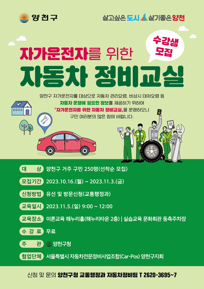 [시민일보 = 이대우 기자] 서울 양천구(구청장 이기재)가 오는 11월5일 해누리타운 해누리홀과 양천문화회관 동측 주차장에서 차량 관리 비법과 기초 정비 요령을 전수하는 ‘자가운전자를 위한 무료 자동차 정비교실’을 개최한다.