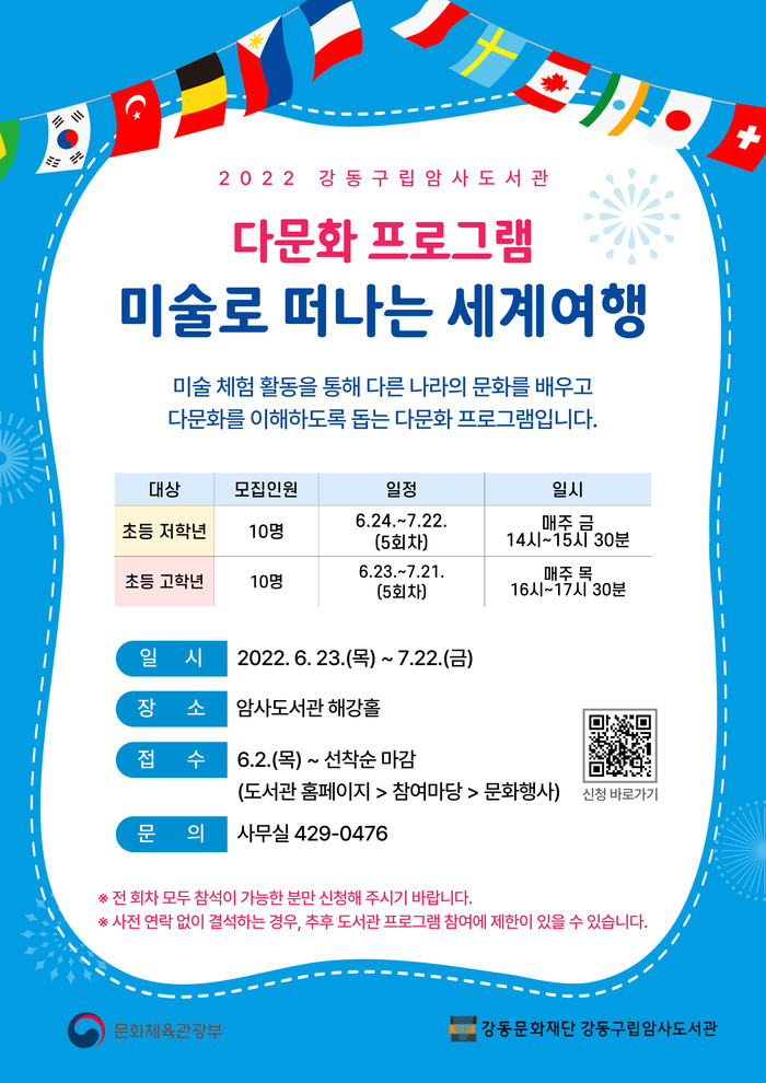 프로그램 참가 신청은 강동구립도서관 홈페이지에서 할 수 있고, 기타 궁금한 사항은 전화로 문의하면 된다.
