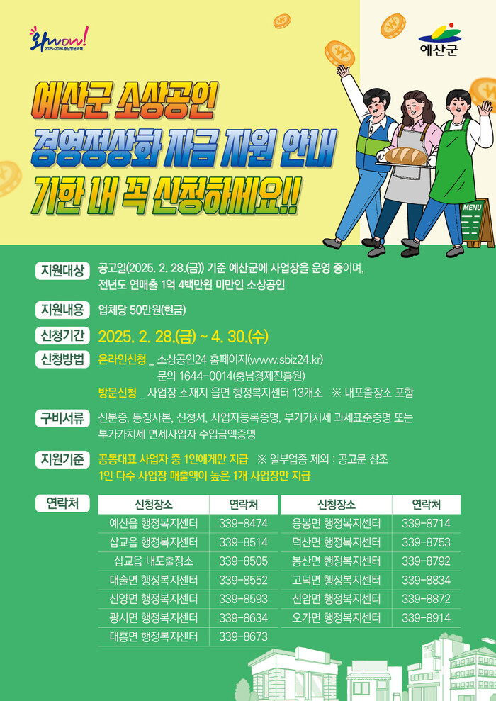 신청기간은 당초 18일에서 30일로 연장됐으며, 온라인 신청은 소상공인24 홈페이지, 방문 신청은 사업장 소재지 읍ㆍ면 행정복지센터에서 가능하다.
