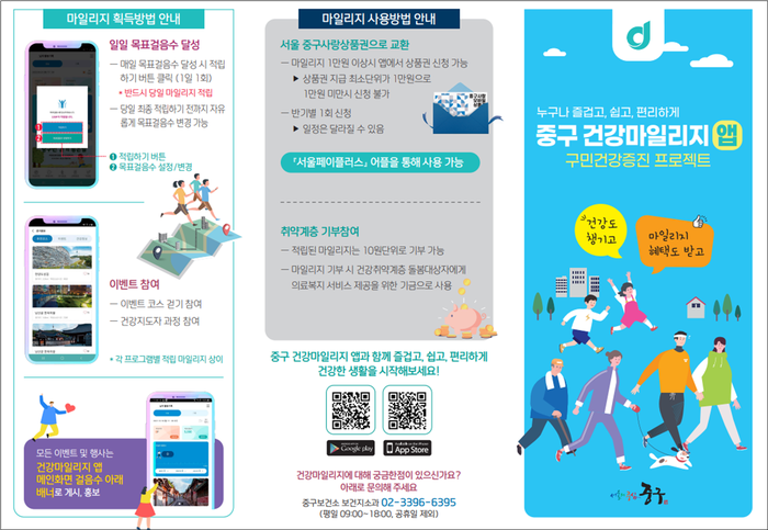 한편 구건강마일리지 앱을 설치하고 걸으면, 걸음 수에 따라 중구민은 하루 최대 200점, 타지역 거주민은 50점까지 적립 가능하다. 연간 최대 10만점까지 쌓을 수 있으며 자세한 사항은 보건지소과로 문의하면 된다.