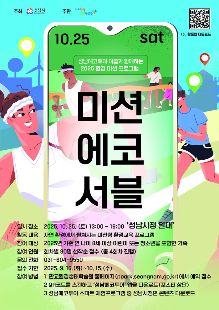 [성남=오왕석 기자] 성남시(시장 신상진)는 오는 10월 25일 오후 1시~4시 시청 곳곳에서 가족 단위 초·중학생 120개 팀(팀당 2~4명, 총 360명)이 참여하는 ‘미션에코서블’ 프로그램을 진행한다.