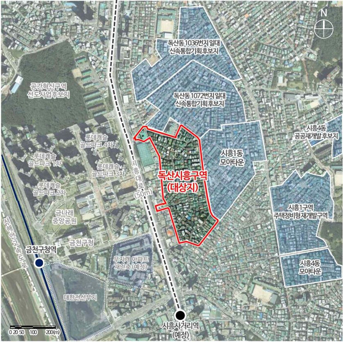 독산시흥구역은 2022년 12월 서울시 신속통합기획 2차에 후보지로 선정된 노후 저층 주거지로, 면적 약 8만8000㎡에 최고 45층, 16개동, 2072세대 규모의 아파트가 들어설 예정이다.