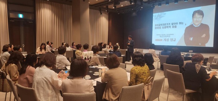 사공 교수는 '유아교육전문가가 알아야 하는 유아의 뇌과학적 마음'이라는 주제 강연에서 기존의 일방적인 주입식 강연 형식에서 탈피해 청중들의 좌석 속에서 청중과 쌍방향으로 자유롭게 질문하고 대화하는 즉문즉답 형식으로 150분간 진행했다.