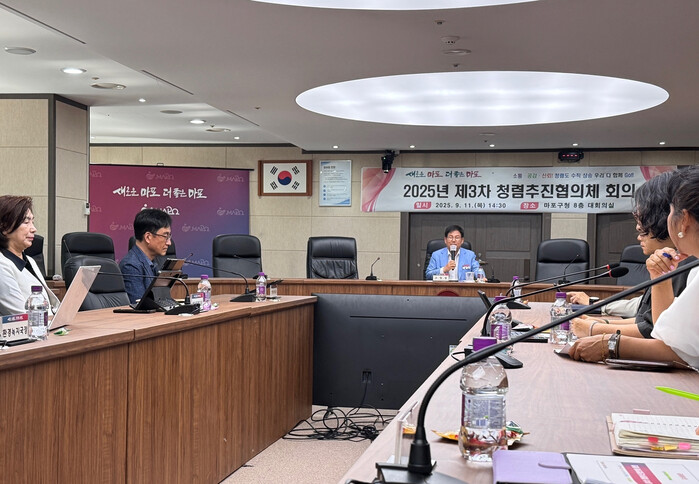 [시민일보 = 문민호 기자] 마포구(구청장 박강수)는 최근 구청 대회의실에서 ‘2025년 제3차 청렴추진협의체 회의’를 열고, 청렴시책의 이행 상황을 점검하며 부패취약 분야 개선과 청렴문화 확산 방안을 논의했다고 19일 밝혔다.