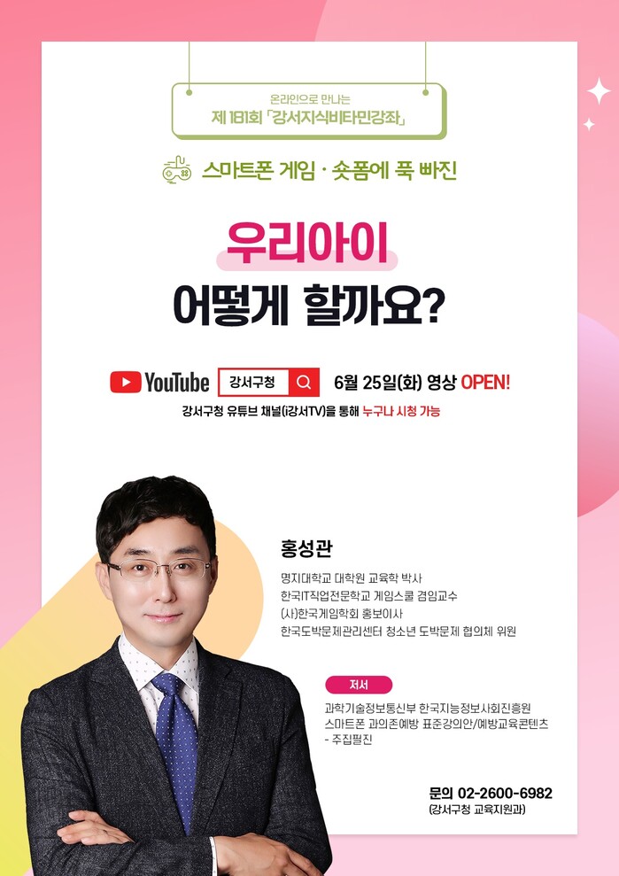 [시민일보 = 변은선 기자] 서울 강서구(구청장 진교훈)가 오는 25일부터 ‘스마트폰 게임·숏폼에 푹 빠진, 우리 아이 어떻게 할까요?’라는 주제로 제181회 강서지식비타민강좌를 진행한다.