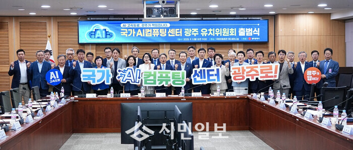 | ▲ 강기정 광주광역시장(사진 앞줄 가운데)이 지난 1일 오전 서울 여의도 국회 의원회관 제2세미나실에서 열린 '국가 AI컴퓨팅센터 광주 유치위원회 출범식'에 참석해 주요 내빈들과 퍼포먼스를 하고 있다./광주광역시 제공 |