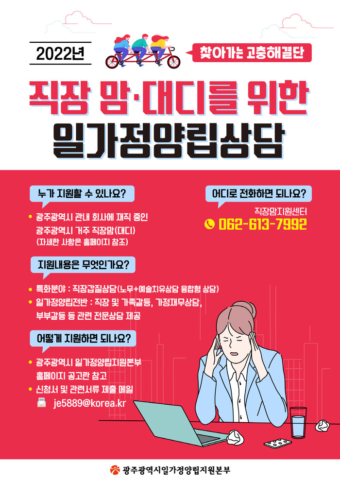 진행 방법 등 문의사항은 광주시 일·가정양립지원본부 직장맘지원센터로 문의하고, 신청서류 등은 시 홈페이지 또는 일·가정양립지원본부 공지사항을 참조하면 된다.