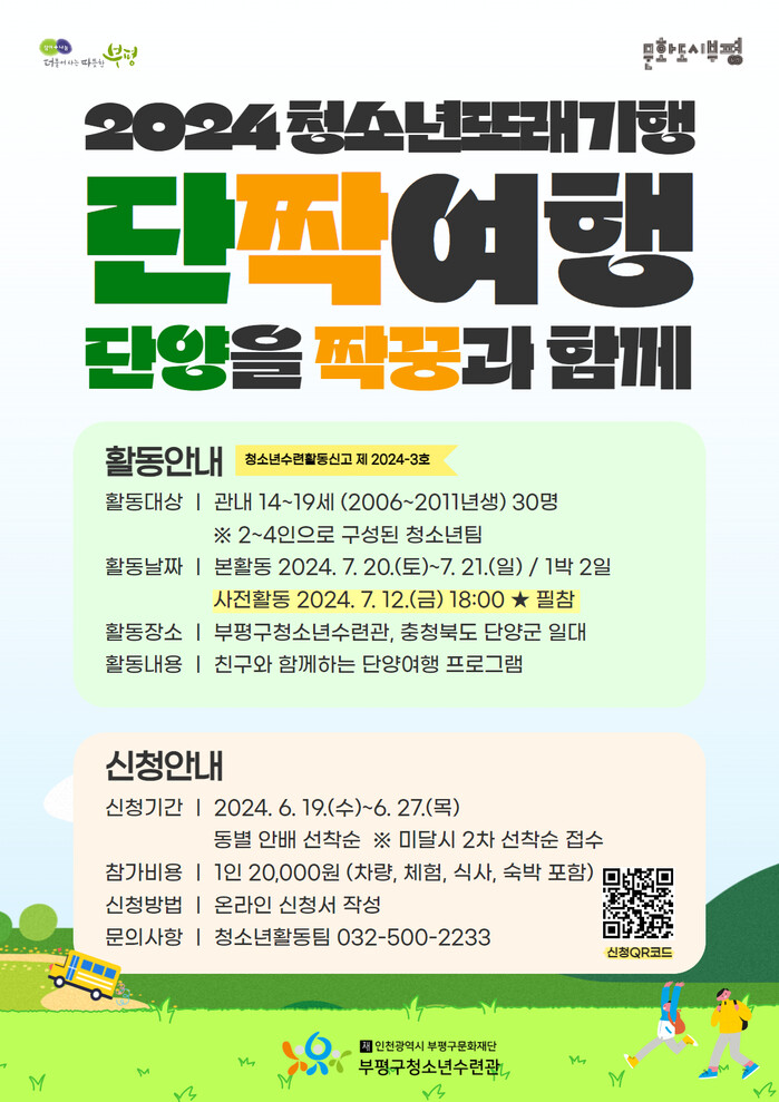 [인천=문찬식 기자] 인천 부평구 청소년수련관이 2024 청소년또래기행 ‘단짝(단양을 짝꿍과 함께)여행’의 참가자를 오는 27일까지 모집한다.
