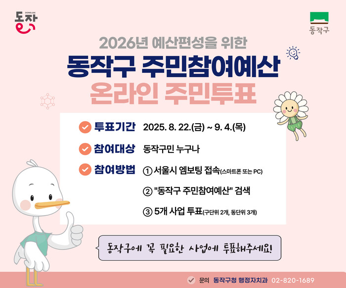 [시민일보 = 여영준 기자] 동작구(구청장 박일하)는 ‘2026년도 주민참여예산’ 사업 선정을 위한 전자투표(엠보팅)를 실시한다고 21일 밝혔다.