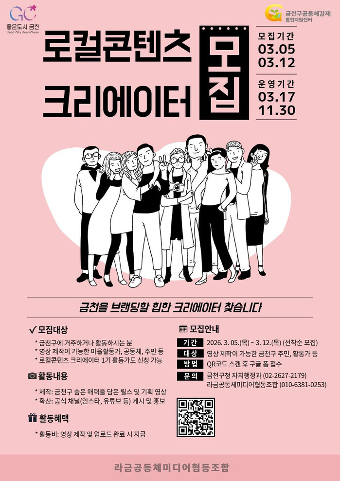 [시민일보 = 여영준 기자] 금천구(구청장 유성훈)는 오는 12일까지 지역의 다양한 이야기를 영상 콘텐츠로 제작할 ‘2026 로컬콘텐츠 크리에이터’를 모집한다고 밝혔다.