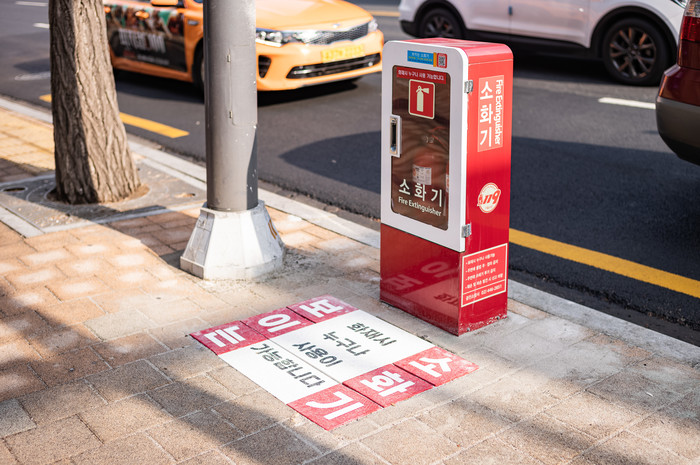 바닥에 새겨진 ‘싸인블록’은 눈에 띄는 빨간색 배경에 소화기 모양을 그려놓고, ‘화재 시 누구나 사용이 가능합니다’란 문구를 띄워 보행자들의 시선을 사로잡는다. UV 차단안료와 유색의 특수 콘크리트를 사용해 쉽게 변색되지 않는 특징도 있다.
