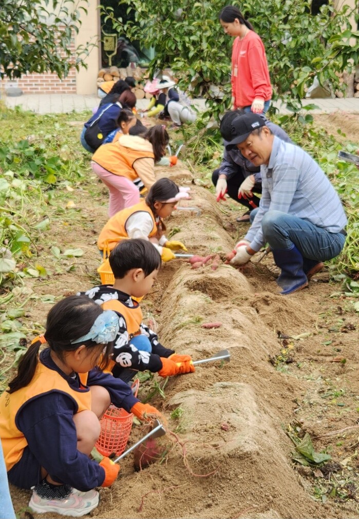 경기 여주시는 4일 연라동에 위치한 농촌테마공원에서 지역내 유치원 및 어린이집을 대상으로 무료로 진행하는 농촌 체험 프로그램을 개최했다. 텃밭에서 재배한 고구마 및 땅콩을 수확하고 제철 작물을 활용한 조리 실습(고구마 피자·잼, 채소 피클, 사과·당근 주스) 등을 실시했다. 사진은 참여 어린이들이 고구마를 수확하고 있는 모습. (사진=여주시청 제공)