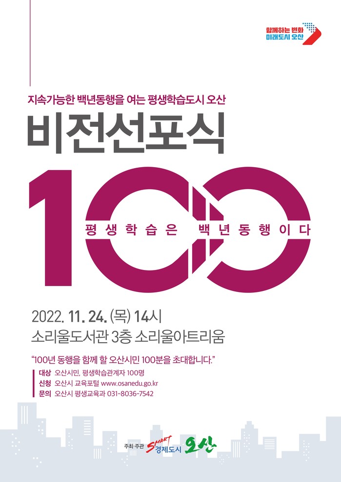 ‘함께하는 변화 미래도시 오산’이라는 시정 슬로건처럼 시민과 함께 학습을 통해 시대변화에 대응하며 앞으로 100년을 준비하고자 하는 이번 평생학습 비전선포식은 특별히 ‘100년 동행을 위한 100인 초대’라는 컨셉트로 진행된다.