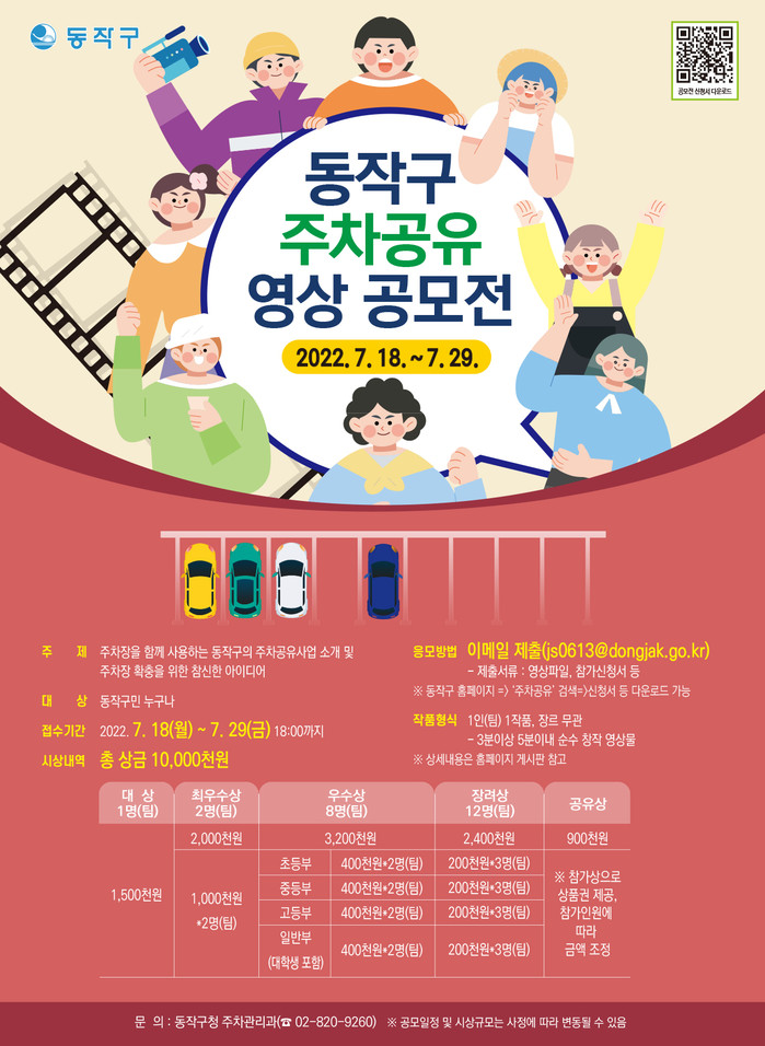 주차공유문화와 영상제작에 관심 있는 동작구민 또는 동작구 소재 직장인, 지역내 초·중·고등학교 및 대학교 재학생은 누구나 참가할 수 있으며, 메일(js0613@dongjak.go.kr)로 제출하면 된다.