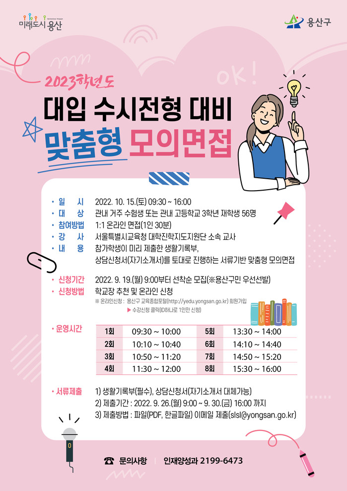 | ▲ 2023학년도 대입 수시전형 대비 맞춤형 모의면접 안내문. (사진제공=용산구청) |
