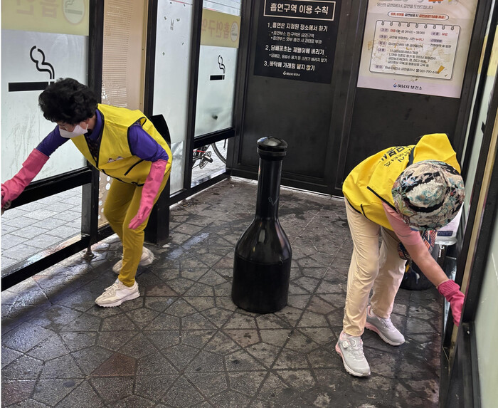 경기 하남시가 최근 금연거리 내 흡연부스에 대한 청결 활동을 실시했다. 이번 활동에는 자원봉사자 11명, 보건소 직원 5명 등 협력해 흡연부스 내부의 담배꽁초 및 쓰레기 수거, 내ㆍ외부 오염물 제거 및 소독 등을 진행했다. 사진은 봉사자들이 청소하는 모습. (사진=하남시청 제공)