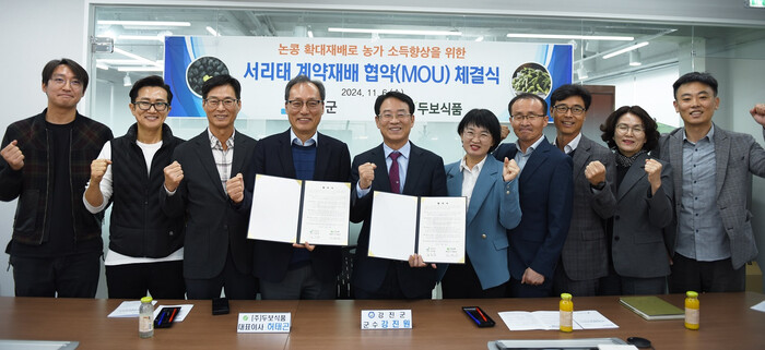 쌀 생산량 조정 정책으로 추진되는 논콩 재배의 경쟁력 있는 추진을 위해 강진원 군수의 의견 제시로 작년부터 시작한 서리태 계약재배는 올해 150ha의 규모로 국내 굴지의 양곡유통회사인 ㈜두보식품과 업무협약을 맺었고, 최근에는 경기도 제과업체와 약 30ha의 규모로 계약했다.
